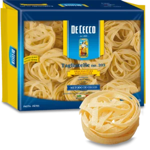 Découvrez les Tagliatelles DE CECCO, soigneusement préparées selon des méthodes artisanales. Elles offrent une cuisson al dente et une texture soyeuse. Elles sont idéales pour une variété de recettes italiennes et conservent leur fermeté et saveur même après cuisson.